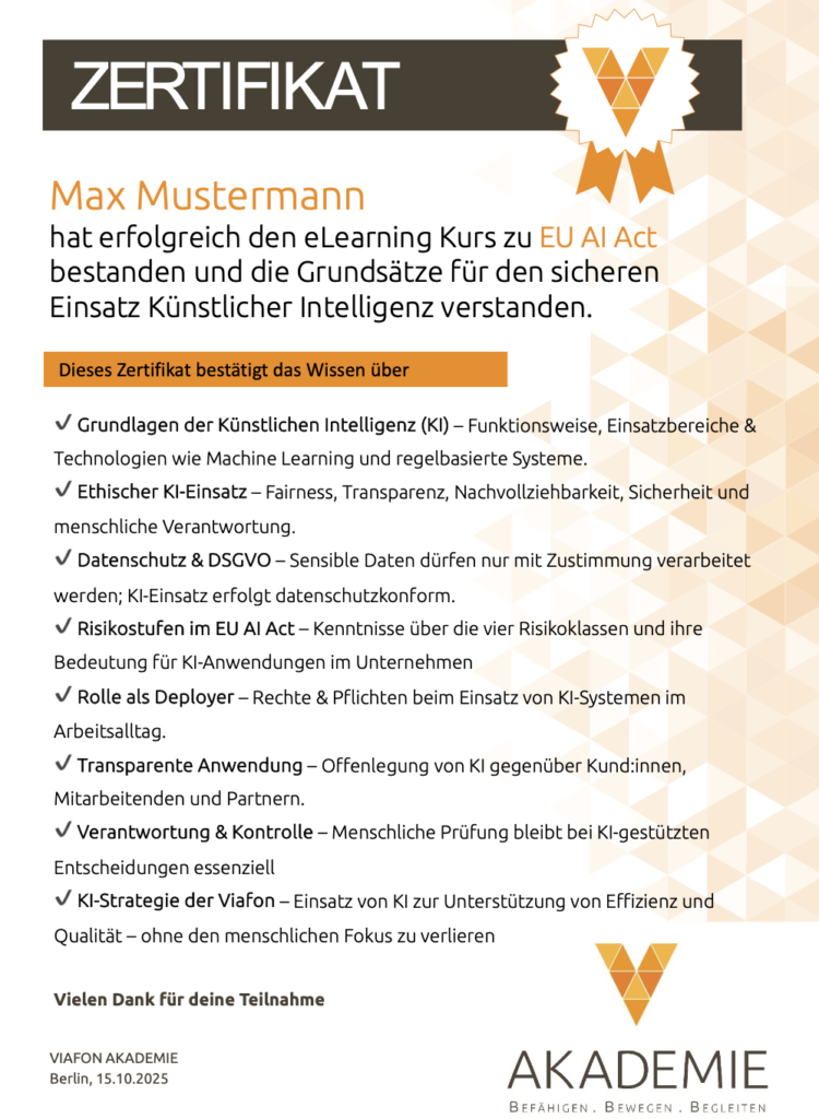 Alle VIAFON-Mitarbeitenden absolvieren ein verpflichtendes Trainingsprogramm zur sicheren Nutzung von KI, ergänzt durch praxisnahe Workshops.